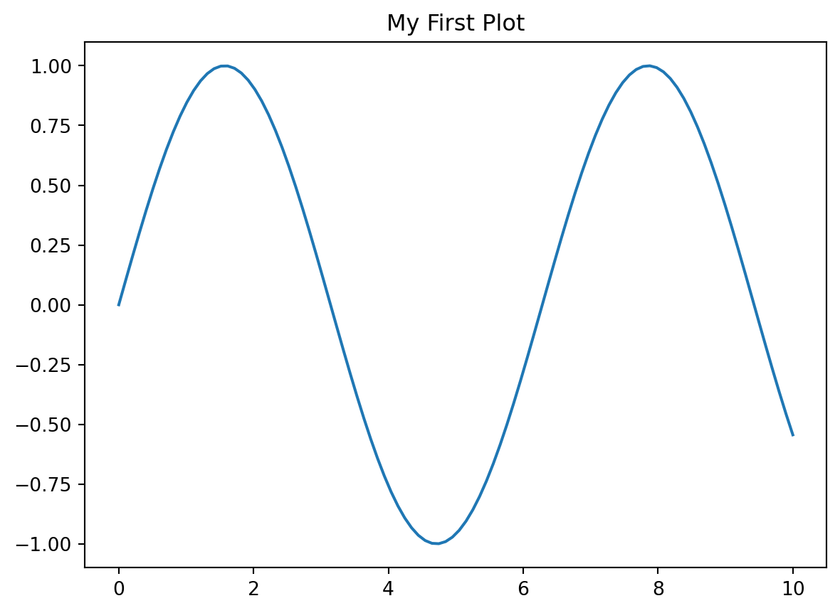 import matplotlib.pyplot as plt import numpy as np x = np.linspace(0, 10, 100) plt.plot(x, np.sin(x)) plt.title("My First Plot") plt.show()